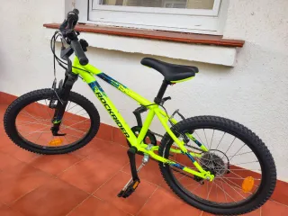 Bicicleta Rockrider de 20 pulgadas en color neón, ideal para jóvenes ciclistas con cambios en el manillar. Está nuevisima, casi sin usar (2 veces en 2 años). El manillar y el sillín se regulan en altura y le pusimos la pata de cabra que de compra no traía.
