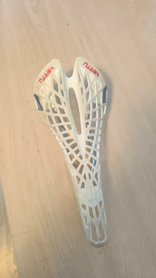 Sillín de bicicleta de la marca Vertu con un diseño innovador y ligero. - Color blanco. - Estructura calada. - Detalles en rojo.