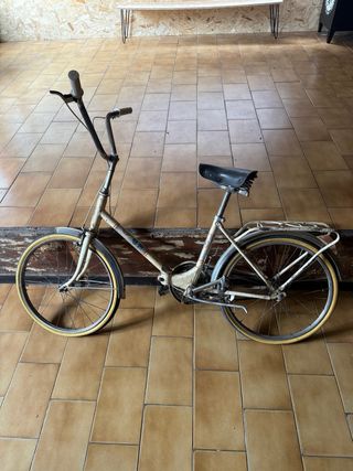Bicicleta clásica BH Gacela, ideal para paseos. - Cuadro de metal plateado. - Ruedas con llantas marrones. - Sillín negro. - Portaequipajes trasero y luz frontal.