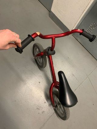 Bicicleta de equilibrio de color rojo, ideal para los más pequeños. Precio original nueva es 199 Euros. - Marco de aluminio ligero. - Ruedas de goma. - Sillín ajustable.