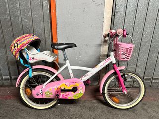 Bicicleta infantil de color blanco y rosa, con detalles de princesas y estrellas. - Incluye cesta delantera rosa. - Sillín y manillar ajustables. - Ruedines de apoyo. - Protector de cadena. - Incluye casco a juego con diseño de colores y dibujos.