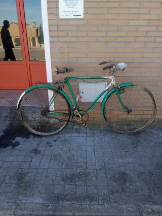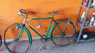 Bicicleta clásica de color verde, ideal para coleccionistas o para restaurar. - Cuadro de metal. - Ruedas de radios. - Sillín de cuero. - Guardabarros delanteros y traseros.IDEAL PARA ESCAPARATE VINTAGE