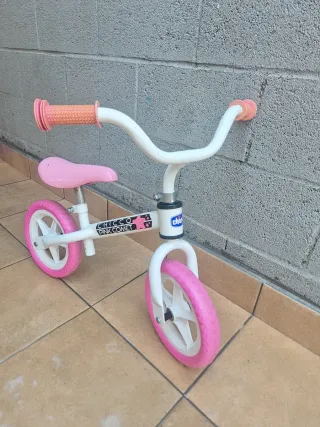 Bicicleta de aprendizaje Chicco Pink Comet, ideal para los más pequeños. - Color blanco y rosa. - Puños de goma para un mejor agarre. - Ruedas de goma rosa. - Sillín acolchado rosa. Se vende porque ya le queda pequeña