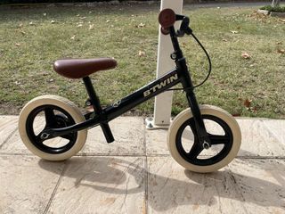 Bicicleta de equilibrio Btwin en color negro con sillín marrón. - Ruedas de color blanco. - Puños marrones. Bien estado, ideal para ir aprendiendo