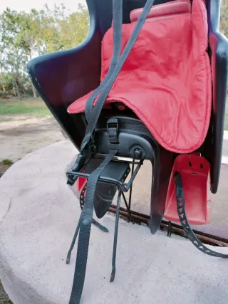 Sillín para bebé de color rojo y negro, diseñado para bicicletas. - Asiento acolchado. - Cinturón de seguridad de tres puntos. - Soporte metálico resistente.