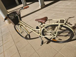 Bicicleta de estilo clásico en color beige, perfecta para paseos urbanos. Incluye una práctica cesta delantera. - Color: Beige - Cesta de mimbre - Sillín y puños marrones - Guardabarros delantero y trasero