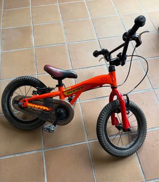 Bicicleta infantil Monty 102 de 14 pulgadas. - Color naranja y rojo. - Sillín con diseño. - Ruedas de goma. - Cadena protegida.
