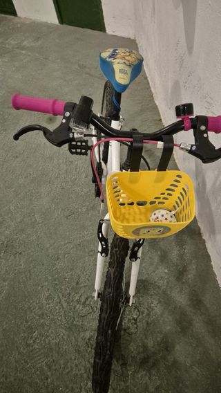 Bicicleta infantil en muy buen estado, ideal para niños y niñas de 7 a 9 años. - Color rosa y blanco. - Cesta delantera. - Guardabarros. - Sillín ajustable.