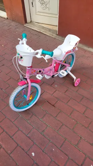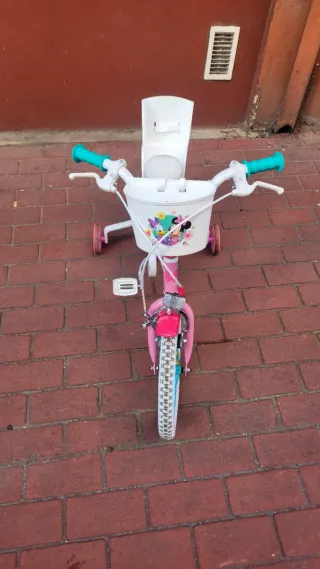 Bicicleta infantil de color rosa con temática de Minnie Mouse, ideal para los más pequeños. Cuenta con ruedines para facilitar el aprendizaje. - Cesta delantera. - Sillín trasero. - Puños de goma. - Ruedas con llantas de color turquesa.
