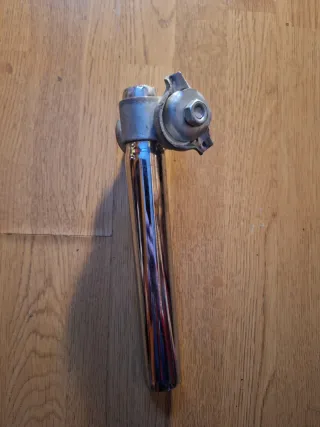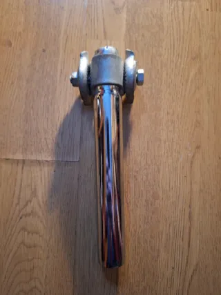 Tija de sillín de bicicleta de estilo clásico con acabado cromado brillante. Pieza de ciclismo clásica, limpiada y probada, en buen estado. mtb zeus orbea bh gac gravel ciclocross techno fixie maneta freno cambio negro gris aluminio acero potencia tija puños goma tornillo apriete decathlon recto vintage retro antiguo montaña Mountain bike urbano shimano campagnolo bianchi colnago vitus altus mirage veloce chorus recoro