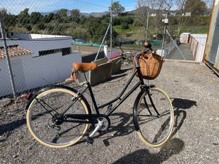 Bicicleta de paseo para mujer en color negro, con un diseño clásico y elegante. Esta en perfecto estado, se nota en las fotografías. Se vende con la cesta, palanca roja de piel del diseño exclusivo, la bolsita detrás. Muy cómodo y estiloso. - Cuadro de acero. - Ruedas de 26 pulgadas con llantas de color crema. - Sillín y puños de cuero marrón. - Cesta delantera de mimbre. - Guardabarros delantero y trasero. - Portabultos trasero. - Cambio de marchas.