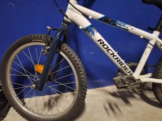Bicicleta Rockrider de 20 pulgadas, ideal para niños de 6 a 9 años. Perfecta para iniciarse en el ciclismo. - Cuadro blanco con detalles azules y negros. - Ruedas todoterreno. - Sillín negro ajustable. - Marchas de cambio No está oxidada, está con algo de barro del uso. Pero en muy buen estado. Mirar sin compromiso. Precio negociable buena bici