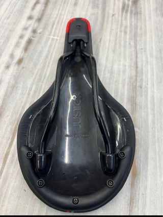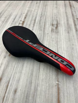 Sillín de bicicleta de la marca Justek, modelo Concept. - Color negro con detalles en rojo y gris. SEMINUEVO