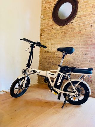 Bicicleta eléctrica plegable de la marca Hitway, modelo BK5. Su diseño compacto la hace ideal para transportarla y guardarla fácilmente. - Color blanco. - Ruedas de 20 pulgadas. - Batería extraíble. - Sillín ajustable. - Plegable para un fácil transporte y almacenamiento.