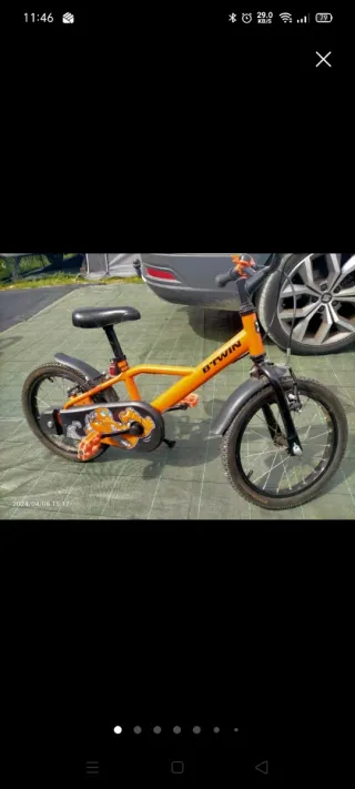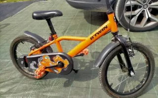 Bicicleta infantil Btwin 500 de color naranja. Como nueva y pagando solo un tercio de que vale en Decathlon. Edad de 4,5 a 6 años aprox. Sillín ajustable en altura (de 48,5 a 60 cm.) Se incluyen extras caballete de 16" y timbre. - Cuadro de acero. - Ruedas de 16 pulgadas. - Frenos delantero y trasero. - Guardabarros delantero y trasero, caballete y timbre.