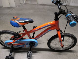 Bicicleta infantil de 16 pulgadas, ideal para los más pequeños. - Color azul con detalles en naranja. - Ruedines de apoyo incluidos. - Sillín ajustable en altura. Negociable