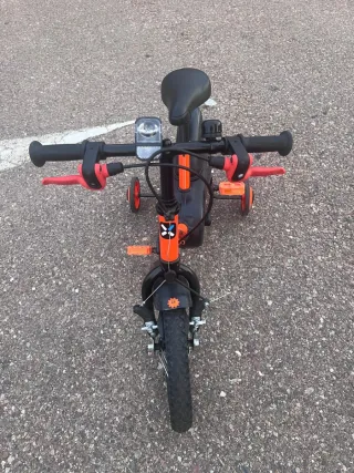 Bicicleta infantil con un diseño llamativo en color naranja y negro. - Ruedines incluidos para mayor estabilidad. - Manillar con puños negros y detalles rojos. - Sillín negro. - Faro delantero.Venta en persona.