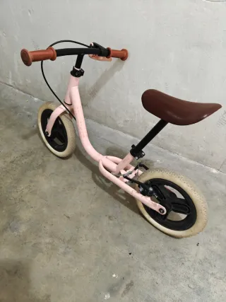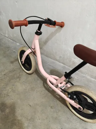 Bicicleta de equilibrio infantil en color rosa con detalles florales. - Manillar y sillín en tono marrón. - Ruedas blancas.