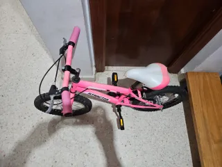 Bicicleta infantil de color rosa, ideal para los más pequeños. - Cuadro de metal resistente. - Ruedas negras con buen agarre. - Sillín blanco y rosa. - Puños rosas en el manillar.