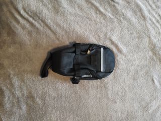 Bolsa de sillín Topeak en color negro. - Material textil resistente. - Cierre de cremallera. - Tiras de sujeción con hebillas. Buen estado general. El único "desperfecto" es el tirador de la cremallera, que le falta un trocito pero no afecta en nada al funcionamiento (ver fotografías)