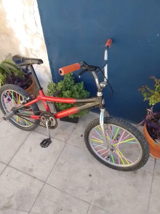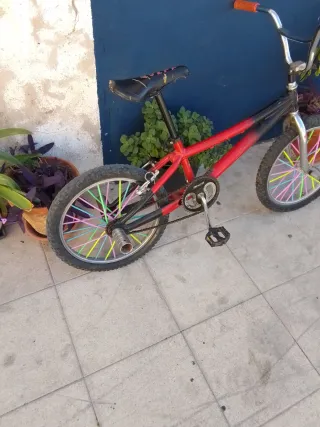 Bicicleta BMX con un diseño llamativo en rojo y negro. Perfecta para paseos y trucos. - Cuadro de metal resistente. - Ruedas con radios de colores. - Manillar plateado con puños naranjas. El sillín un poco desgastado regalo otro