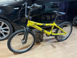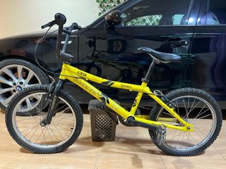 Bicicleta de estilo BMX de la marca Monty, modelo 139 Series. - Color amarillo vibrante. - Ruedas con llantas plateadas y neumáticos negros. - Manillar negro con puños. - Sillín negro. - Pedales negros.