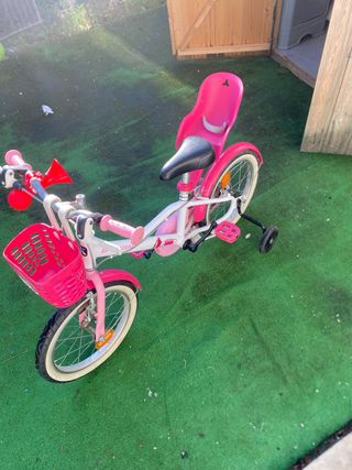 Bicicleta infantil de color rosa, ideal para los primeros paseos. - Cesta delantera. - Sillín trasero. - Ruedines incluidos.
