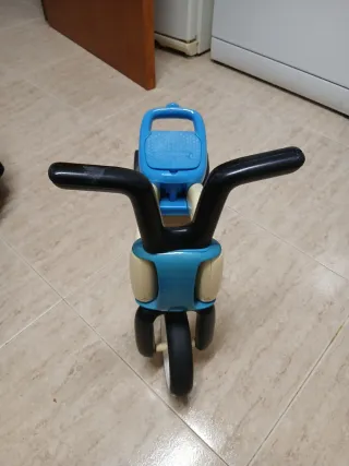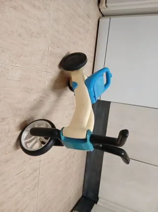 Triciclo de juguete para los más pequeños entre 2 a 3 años, ideal para iniciarse en el equilibrio y la coordinación. Ideal para saber ir en bicicleta. - Estructura de plástico resistente en color crema. - Tapa de sillin se puede levantar y manillar en color azul. - Ruedas negras. Medidas: 60cm de largo, 45cm de alto y 20cm de ancho.