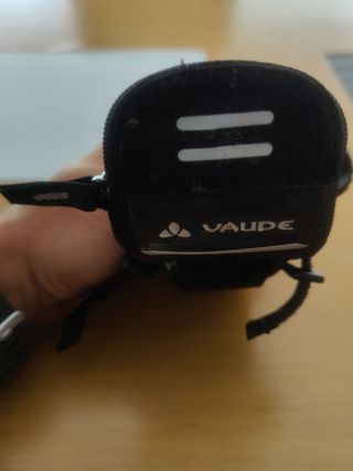 Bolsa porta objetos de la marca Vaude. Es para debajo del sillín y la capacidad es para llevar llaves,multiherramienta y gel o barrita. Es Una bolsa pequeña para llevar lo básico