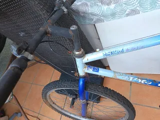 Bicicleta de montaña a la que le falta la rueda delantera. Ideal para piezas o para quien quiera completarla.es mejor ponerle la rueda,la bici está bien todo lo demás , La rueda es que me la robaron. Es una buena bicicleta y el sillín es muy cómodo y si quieres te doy el sillín que traía que está nuevo. La rueda de detrás está bien ,no pinchada ni estropea,ya que está en alto es solo llenarla que lo haré yo. - Cuadro de bicicleta de montaña. - Rueda trasera incluida. - Sillín. - Manillar.