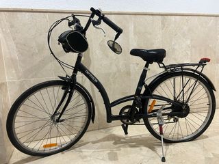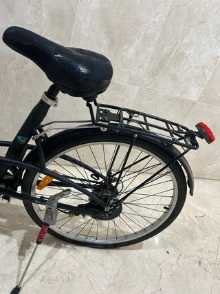 Bicicleta urbana Decathlon en color negro. Ideal para desplazamientos diarios. - Cuadro de bicicleta. - Ruedas de bicicleta. - Sillín de bicicleta. - Manillar de bicicleta. - Pedales de bicicleta. - Guardabarros. - Portabultos trasero. - Pata de cabra. Nada mas que hay que comprarle las cámaras de adentro de la ruedas y listo