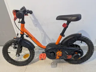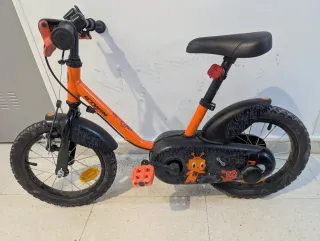 Bicicleta infantil de la marca Btwin, color naranja. - Ruedas de 12 pulgadas. - Frenos delanteros y traseros. - Sillín ajustable. - Guardabarros delantero y trasero. - Diseño con dibujos de robots.