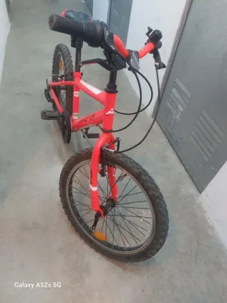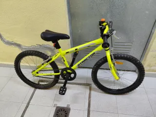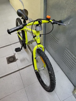 Bicicleta infantil marca Atractor de Decathlon, con ruedas de 20 pulgadas. - Color amarillo brillante. - Sillín negro ajustable. - Manillar con puños negros. - Ruedas todoterreno.