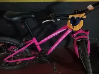 Bicicleta Specialized de color rosa con ruedas de 20 pulgadas. - Cuadro de aluminio. - Frenos delanteros y traseros. - Suspensión delantera. - Sillín ajustable.