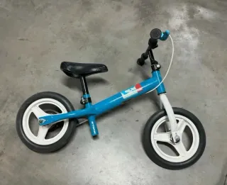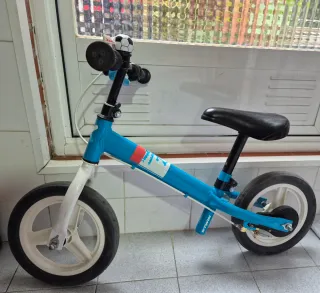 Bicicleta de equilibrio de color azul, ideal para los más pequeños. - Marco de metal resistente. - Ruedas de goma. - Sillín ajustable. - Diseño deportivo. -marca B-twin Decathlon