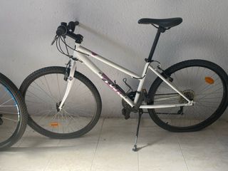 Bicicleta blanca con detalles morados, ideal para jóvenes ciclistas. - Rueda delantera de 26 pulgadas. - Cuadro de aluminio ligero. - Frenos de disco. - Sillín ajustable. - Incluye pata de cabra. -No usada apenas Las ruedas estan deshinchadas