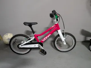Bicicleta infantil Woom 2 en color rosa vibrante, nueva sin usar. - Cuadro ligero y resistente. - Ruedas de 14 pulgadas. - Frenos adaptados para niños. - Sillín ajustable en altura.