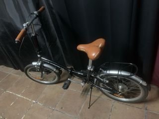 Bicicleta plegable Btwin en color azul marino con detalles en verde lima revisada y en perfecto estado. - Cuadro plegable. - Ruedas de 20 pulgadas. - Cambioo de 6 velocidades Shimano 105 - Guardabarros delantero y trasero. - Sillín negro. - Manillar y sillin ajustable en altura. - Luce delantera, timbre y reflectantes para mayor seguridad