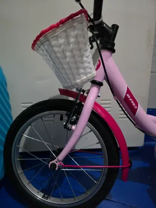 Bicicleta infantil de la marca Btwin, en color naranja. Ruedas de 16 pulgadas. Frenos delantero y trasero. Sillín ajustable en altura. Dispone de ruedines. Está nueva,sólo la usó 1 vez,porque realmente no le gusta la bici al niño,tiene el desgaste que se ve en la foto 4ª de tenerla atada con una cuerda,pero está perfecta. La podéis probar sin compromiso.Costó 140,la dejo en 80€
