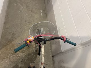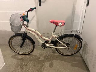 Bicicleta infantil de color blanco con detalles decorativos y cesta delantera. - Cesta de metal. - Sillín rosa con diseño. - Guardabarros delantero y trasero. - Portabultos trasero. Tiene bastante uso pero funciona en perfectas condiciones.