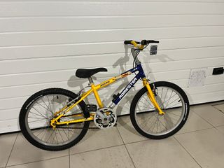 Bicicleta infantil de 20 pulgadas con un diseño llamativo en amarillo y azul. - Cuadro de metal resistente. - Ruedas de 20 pulgadas. - Sillín negro. - Manillar amarillo.