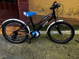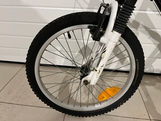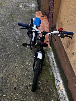 Bicicleta infantil de la marca Decathlon, ideal para los más pequeños. - Cuadro blanco y azul con detalles. - Ruedas de 20 pulgadas. - Sillín negro. - Frenos. - Pedales.