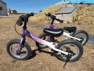Se venden dos bicicletas de aprendizaje sin pedales de la marca Bikestar en color morado. Perfectas para iniciarse en el mundo de las dos ruedas. - Color morado con detalles florales. - Sillín negro. - Manillar negro (uno tiene una pequeña rozadura) - Con pata de cabra - Ideal para gemel@s/melliz@s - Casi como nuevas: muy bien conservadas