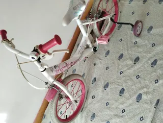 Bicicleta de paseo para niña con ruedines. - Color blanco y rosa. - Ruedas con llantas rosas. - Sillín blanco. - Puños y pedales rosas. - Timbre incluido. Tiene rueda trasero pinchada.