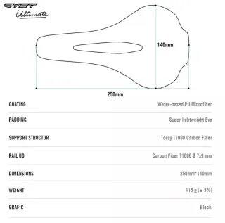 Sillín de bicicleta en color negro, modelo Ultimate. - Diseño ligero y aerodinámico. - Materiales de alta calidad. - Peso aproximado de 140g ± 5g.