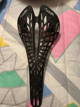 Sillín de bicicleta marca Vertu en color negro. Diseño moderno y ligero. - Material: Compuesto de carbono. - Diseño hueco para ventilación. - Logotipo Vertu en relieve.