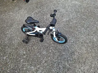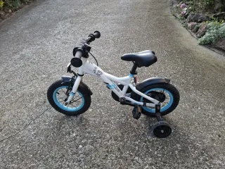 Bicicleta infantil BTwin en color blanco y azul. - Diseñada para niños de 4 a 7 años. - Ruedas de 16 pulgadas. - Frenos delanteros y traseros. - Sillín ajustable.