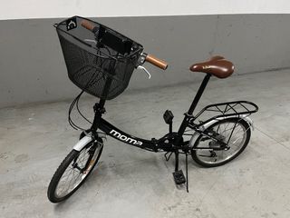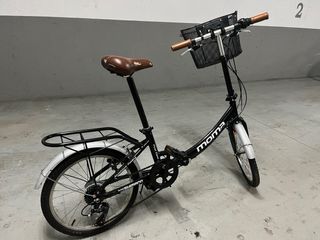 Bicicleta plegable Moma en color negro. Ideal para desplazamientos urbanos y fácil de guardar. Se vende con muy poco uso. Siempre guardada en parquing cerrado. - Cesta delantera. - Portabultos trasero. - Sillín marrón en perfecto estado. - Puños marrones. - Cambio shimano con 6 marchas.