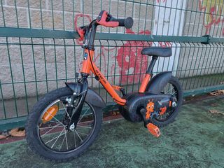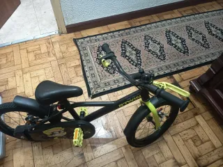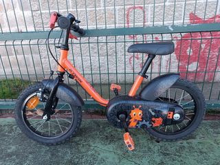 Bicicleta de color naranja y negro. Un único dueño. Poco uso. Todo está en muy buen estado (sillín, pintura, ruedas, puños,...). Ideal para regalar - Ruedas de 14 pulgadas. - Frenos delanteros y traseros. - Sillín ajustable. - Guardabarros delantero y trasero. * Precio de compra: más de 100€ 3 años 4 años 5 años tres cuatro cinco