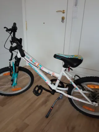 Bicicleta infantil de montaña, ideal para niñas. Cambio de 6 velocidades. Amortiguación delantera y pata de cabra. Valorada nueva en 189€ - Cuadro blanco con detalles de flores. - Ruedas de 20 pulgadas. - Sillín con diseño. - Frenos de mano.